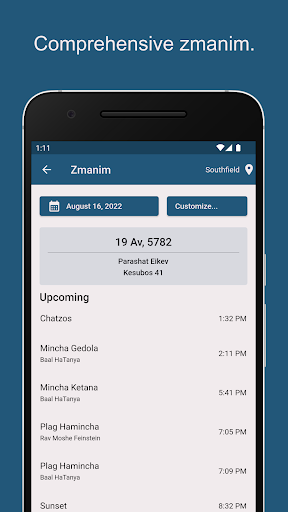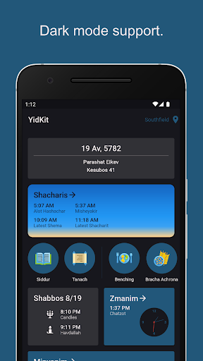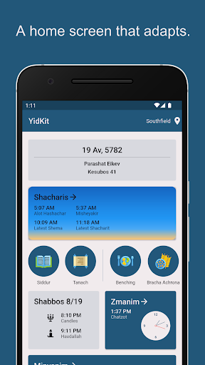 YidKit features an adaptable Home Screen that changes based on the date and time of day.