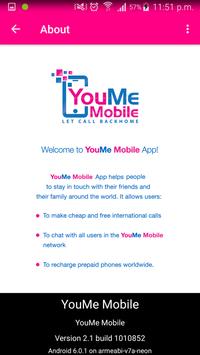 YouMe Mobile App allows people to stay in touch with their friends, their family and their love ones around the world. It allows to make cheap and free international calls, to chat with all users in the YouMe Mobile network, to recharge prepaid phones worldwide.