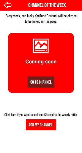 Add your channel to the Channel of the Week raffle for a chance to win at having your own channel displayed within the app for 1 whole week. Just add your channel to the raffle and each week one random, lucky person will have their channel advertised with a link to the channel within the app so everyone using the app can see it. Good Luck.