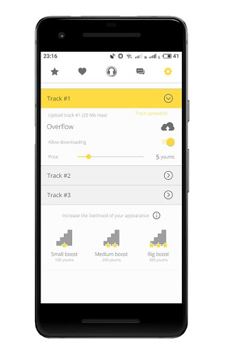 Good idea for an app. Unfortunately it doesn't always work properly... Sometimes gives you the same music to rate or won't play any music (only show the image). Also, I used like 10 big boosts and still no one see my profile... No more Youms(app's currency), no more music to rate (so no more ways to earn youms) - means the app is useless for musicians as no one hears your music. There's more reviews with this problem here....