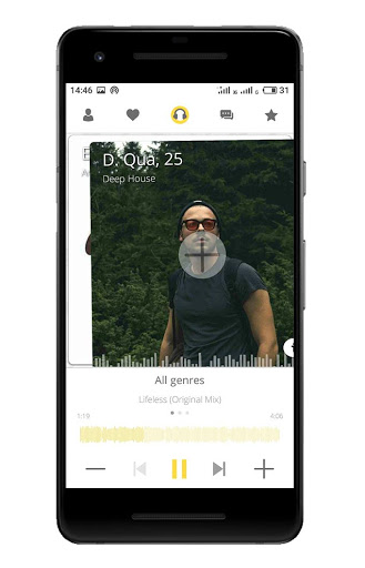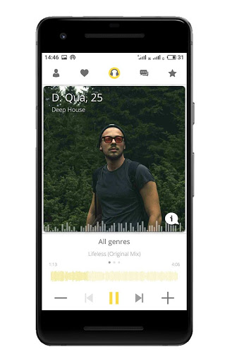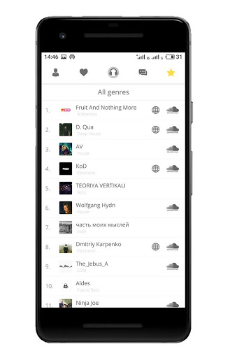 From here, you can go to the profile page of musicians by clicking on their profile image. In the profile window you can listen to the musician's works. Also, from here, you can start the correspondence with him inside the application, go to the musician profile in Soundcloud (if the musician left a link to the profile) and download the musician's music (if he gave permission for this action).