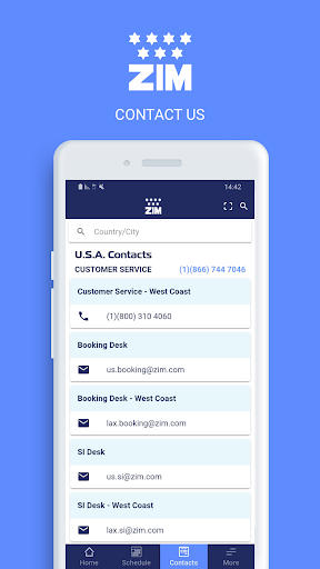This version offers easy access to manage your shipments online, real time container tracking, vessel schedules and local contacts. ZIM’s mobile application enables easy and intuitive access to a large range of cargo shipping services, just for you, including myZIM Personal Area, Container Tracking, Find Your Route, Vessels Schedule, Find Local Contacts,