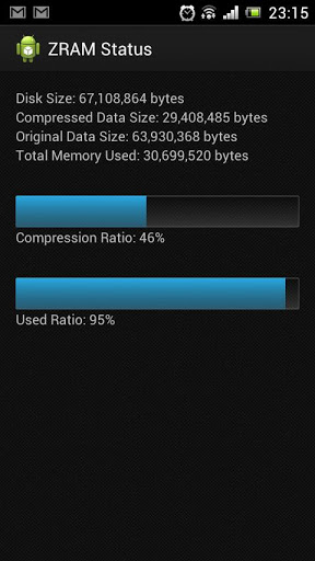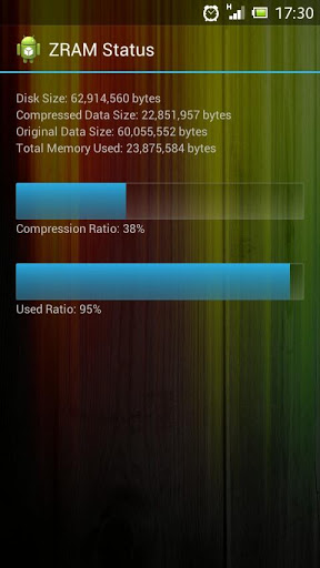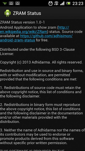 Android application to show ZRAM (http://en.wikipedia.org/wiki/ZRam) status. If you don't know what is ZRAM, than you probably doesn't need this application.What is ZRAM (quoted from Wikipedia):zRam is an experimental (staging) module of the Linux kernel. It was previously called "compcache". zRam increases performance by avoiding paging on disk and instead uses a compressed block device in RAM in which paging takes place until it is necessary to use the swap space on the hard disk drive. Since using RAM is faster than using disks, zRam allows Linux to make more use of RAM when swapping/paging is required, especially on older computers with less RAM installed.Even though the cost of RAM hardware is relatively low this feature still offers advantages for netbooks and other lower-powered laptops, virtualization and in the case of embedded devices, especially those that use flash memories that have a limited lifespan, dependent on write-use and thus wear out quickly when used as a swap device.CAUTION: Use only with ZRAM enabled device and kernel.Known working devices:* Sony Ericsson Xperia Arc S (should work with other Xperia 2011 too) latest stock ROM and kernel.* Latest Lupus kernel for Xperia ICS stock.Source code available at https://github.com/adhisimon/android-zram-status for free. Please visit http://adhisimon.github.com/android-zram-status for more information ZRAM Status is distributed under The BSD 3-Clause License.