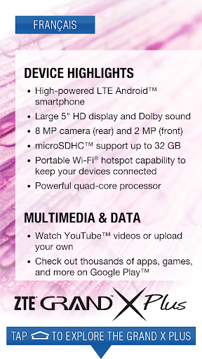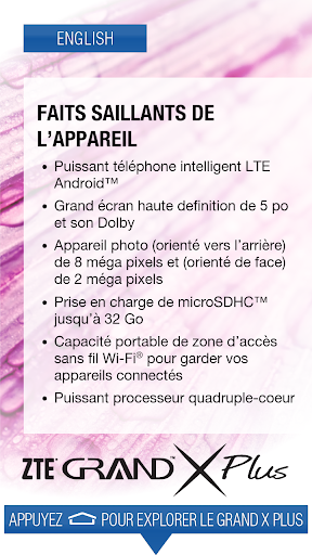 Download the ZTE Grand X™ Plus On-Device Demo for a video demonstration highlighting the key features of this premium device. Enjoy its 5-inch HD display for crisp, clear images, explore the professional picture quality of the 8 MP camera and 1080p HD camcorder, and go longer with the 2,300 mAh battery, which provides up to 8 hours of talk time. The app is in both English and French.