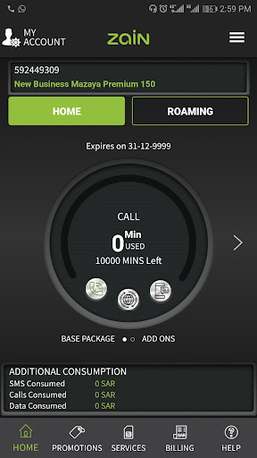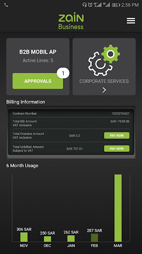 Through Zain Business application, you can manage all your services whether calls or data, prepaid or postpaid. From the dashboard, you can view your current benefits and usage, mange many other services (add and delete services, upgrade packages and control the credit limit) for your line and your contract lines, you can also recharge and pay bills for your line, contract lines or any Zain customer in a number of ways (credit card, Recharge card, or Sadad). In the case of roaming you can know the best networks and offers. As well as the possibility of hearing, buying and giving Sam3hom and participation in the latest games and applications.