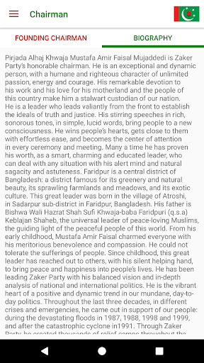 Peerjada Alhaj Khwaja Mostafa Amir Faisal Mujaddedi is the founding Chairman of Zaker Party. First, in 1987, at the time of the founding of Zaker Shongothon, he was nominated an honorable member of the Supreme Command Council. After two years’ successful organizational activity, in 1989, Zaker Shongothon transmuted itself into Zaker Party.
