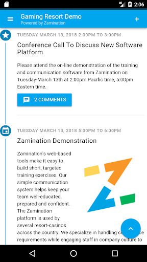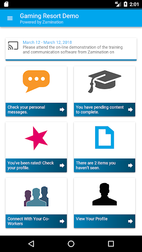 The Zam Mobile app gives you access to your Zamination profile, gives you tools to contact your co-workers, lets you view your Zamination notifications, and shows your company newsfeed.