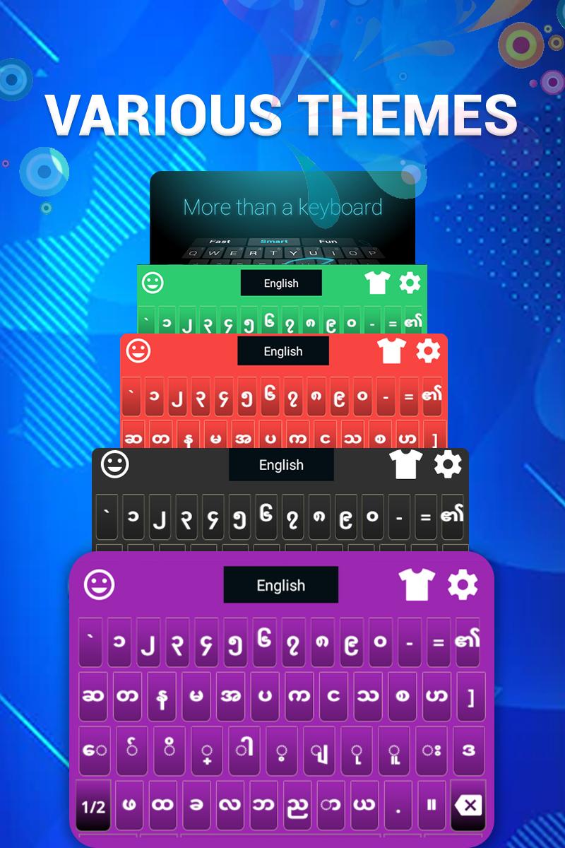 Stylize your new Zawgyi Myanmar keyboard for android with new looks. More than 20 colors to change background color of Zawgyi Myanmar typing keyboard. Beautiful pictures for keyboard background and different sound options for easy-go keyboard typing experience