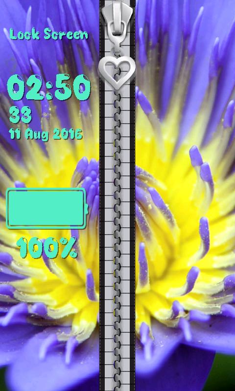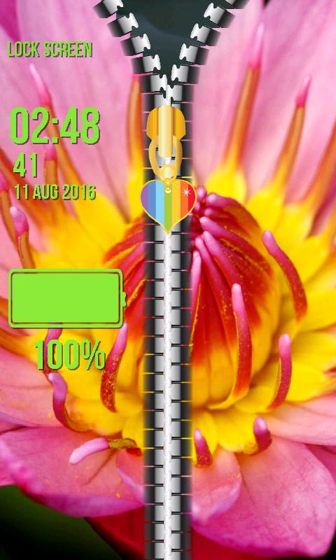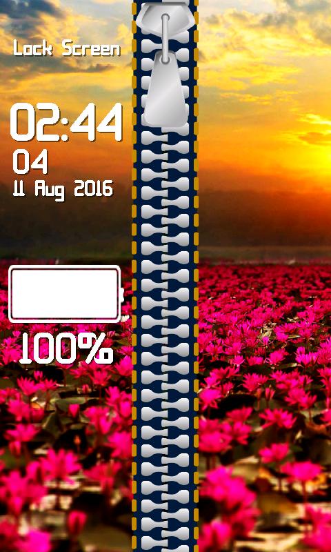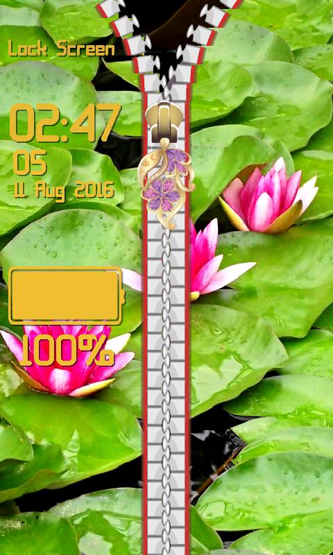 Pink nenuphar is sitting on the droplets bathed leaves in the middle of the lake, and you caught a glance of it while you were passing there. It completely took your breath away, and you are not willing to leave now. With the top Zipper Lock Screen Lotus you will be able to admire this beauty on your device all the time. On the perfect foreground you can set time and date to always be displayed. Make their font and color adjust your photos, and enjoy the fantastic look of your screen. Tap the hook to unzip the popular zipper locker and you will find yourself in a magical place from your dreams. Wherever you look are incredible blossoms and you feel totally overwhelmed. Get the best Zipper Lock Screen Lotus and improve your device.