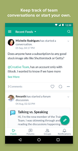 Start conversations with co-workers, @mention users or groups, like, comment, share, and follow posts, or start a poll and get to know what your team thinks.