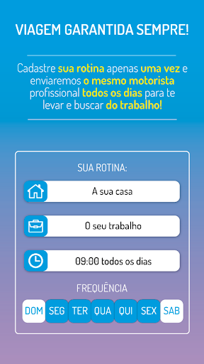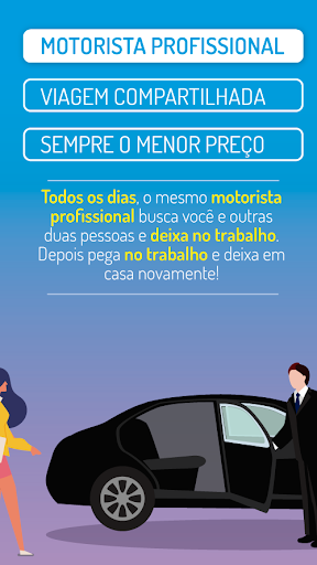 O usuário cadastra sua rotina de deslocamento para o trabalho, e todos os dias enviamos o mesmo motorista profissional para buscar você e outras duas pessoas que também estejam no trajeto.