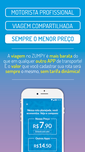A viagem no ZUMPY é mais barata do que em qualquer outro app de transporte! Por ser um trajeto compartilhado, você paga mais barato pela viagem além disso somos mais baratos até que os aplicativos de COMPARTILHA e JUNTOS!