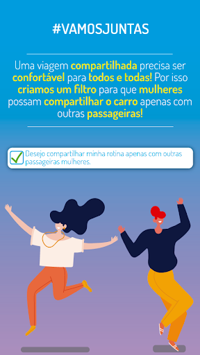 Para garantir mais comodidade e segurança mulheres podem optar por compartilhar sua rota apenas com outras passageiras mulheres! Afinal conforto vai muito além de andar de carro não é mesmo?