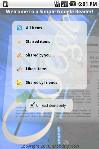 Please note: This client will not work correctly if Google services or Google Reader is not accessible in your area. To verify, please use the browser on your mobile phone to check the accessibility of http://www.google.com/reader.