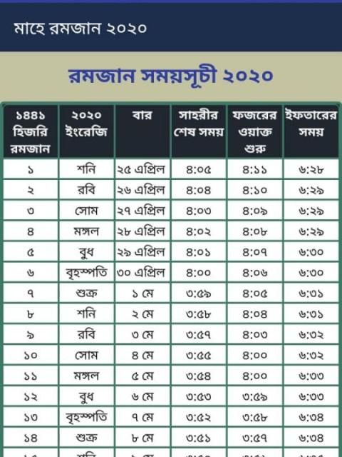 => রমজান ক্যালেন্ডার/সময়সূচী ২০২০