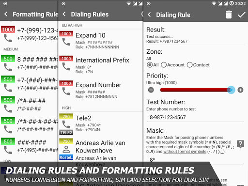 — dialing rules (number conversion and visual formatting, selection of a SIM card for Dual SIM devices)