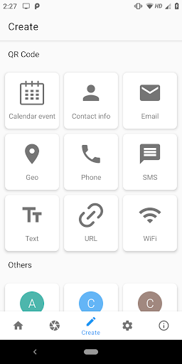 URL, Contact information (VCARD, etc.), Calendar event, Email, Phone, SMS, Wi-Fi, Geo-location (latitude and longitude)
