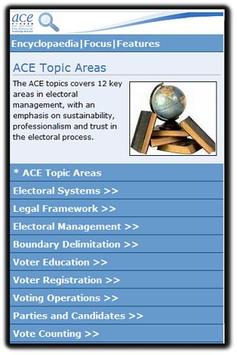 Easy and quick access to the ACE Electoral Knowledge Network from your Android phone. Including the English, Spanish, French, Arabic and Russian version of the Encyclopaedia as well as the Practitioners' Network.