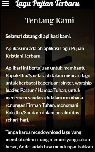Aplikasi Lagu Pujian Terbaru adalah aplikasi yang berisi lagu pujian terbaru. Yang terbagi dalam beberapa kategori : Band / Group, Artist Rohani, Pujian sepanjang masa, Pujian Non-Stop, Pujian sekolah minggu, dan instrumental Rohani.