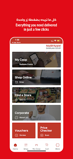 Sharjah Cooperative's smart phone application is the most expedient form of communication between us and our shareholders and valued customers, allowing them to follow all that is new at the Cooperative Society and receive notifications for the promotion campaigns and special offers. They can also view their shopping record for all year long and find out how to reach any of our branches across the emirate.
