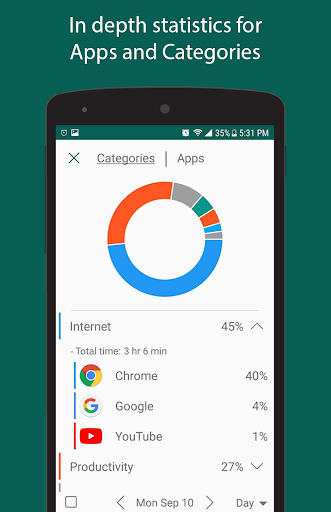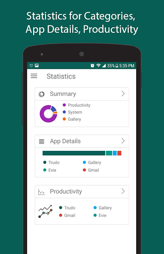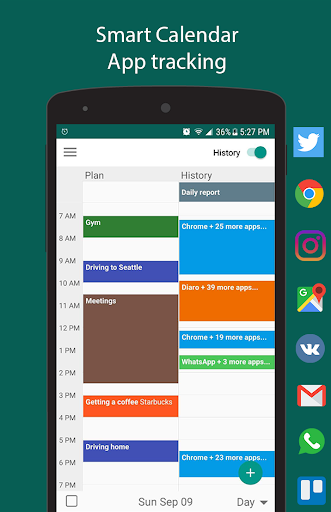 Trudo allows you to do everything you can in Google Calendar, but it does a lot more. Besides your schedule, you can open the timeline/history panel where you can see the app tracking for the day. You can compare your schedule plan with what you actually did during that day. Our app tracking allows you to see in details what apps you've used and for how long. Daily Reports give you the information on how much you've used your phone during the days and how many times you've unlocked it as well as statistics on your app usage. You can see on the statistics page how productive you are.
