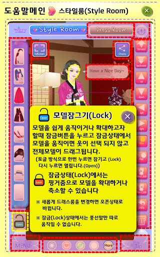 11. Cung cấp chức năng khóa mô hình. Nếu bạn khóa mô hình, bạn không thể chọn hoặc di chuyển một quần áo từng cái một. Sau khi khóa mô hình, phóng to mô hình hoặc di chuyển nó đến kéo. Màn hình khóa mô hình hoặc màn hình chọn mô hình cung cấp chức năng bóng bay. Bạn có thể đặt những quả bóng bay bên cạnh mô hình bằng cách vào quả bóng trong khinh khí cầu. Nếu bạn kéo một phần góc của con ngựa khinh khí cầu, bạn có thể điều chỉnh hướng của những con ngựa của những quả bóng bay. 13. Bạn có thể mở rộng mô hình trong phòng phong cách. (3 lần mở rộng)