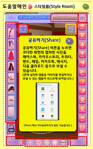 17. Cung cấp chia sẻ hình ảnh. Nhấp vào menu để chọn Chia sẻ phối hợp của tôi (chia sẻ sự phối hợp của tôi) từ menu để chia sẻ sự phối hợp của tôi (Chia sẻ phối hợp Mai) để chia sẻ Facebook, Twitter, Kakao Talk và Gemale. Những bộ quần áo đã được phủ một lớp này sau đó được nhớ đến khi ứng dụng đang chạy một lần nữa và chọn quần áo của họ, và đã nhớ đến các vị trí phủ trước đây để làm cho quần áo vào vị trí đó.