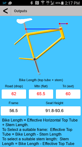 This application tallies your customer’s information and displays the projected frame size with the rider’s specific measurements.
