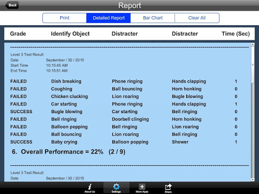 Detail Report: Test results including the grade. object identified, distracter and time taken to finish the test.