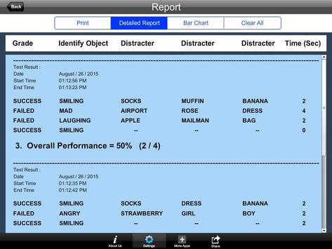 Detail Report: Test results including the grade. object identified, distracter and time taken to finish the test.