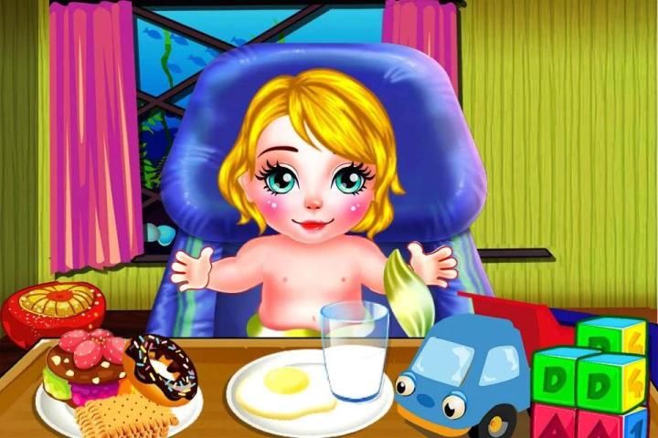 The baby is hungry, feed him some delicious foods, there are many food you can choose, for example donuts, milk, fruits and so on~~~