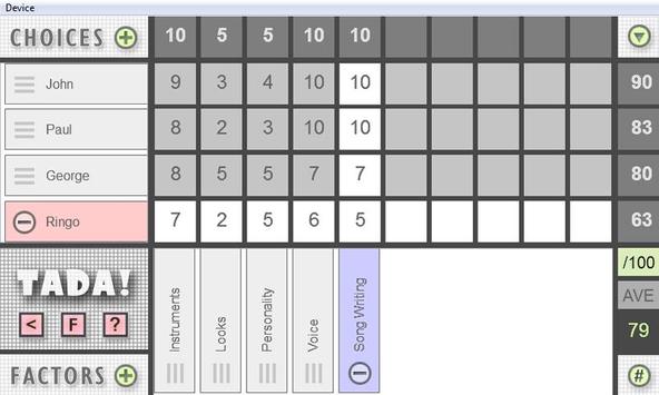 Enter items to rank like sites, apps, people, food and rate them on factors such as usability, fun, nose, taste, etc.