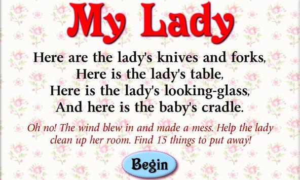 My Lady is brought to you by award-winning software designer Leslie Wilson, creator of www.MotherGoose.com where you will find free games and activities for little kids. My Lady is a fun game for kids ages 2 to 6.