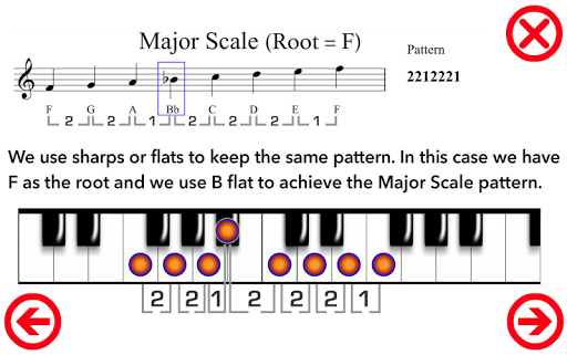 - It shows the musical notation and the “PATTERN” of each scale. The “PATTERN” is the amount of semitones between the notes of a scale.