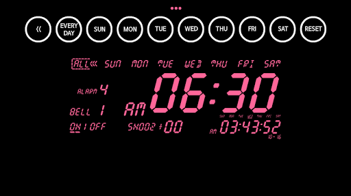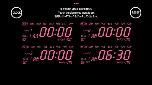 Die Alarmauswahl} Bildschirm zeigt vier Alarme an, und wenn Sie Alarme berühren, die Sie ändern möchten, wird der Alarm ausgewählt und auf { Wählen Sie einen Alarm aus. {Selection Alarm Match} Bildschirm oben :: Zeitglocke :: Touch (Stunde +5) oder (Stunde +1), um die Zeit (Minute +5) oder (Minute +1) einzustellen, um die Minute einzustellen.