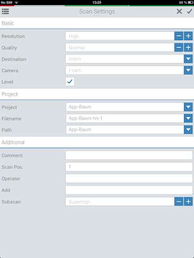 The scan app for products of Z F enables the wireless control and monitoring of the scan. Additionally the scan app includes some measure tools. The app runs on iPhone (iOS from 6.0) and Android. With simple and intuitive menu navigation the user can scan, administer and visualize data directly via a smartphone.