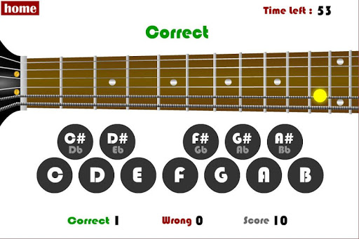 Here's how it works... First an indicator will be displayed on the fretboard randomly from open string to the 12th fret for any of the 6 strings. Your job is simply to select which note you think it is.