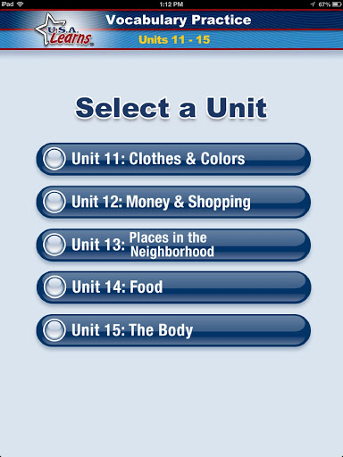 • Download the other USA Learns English Apps for more practice. Each app contains five units: