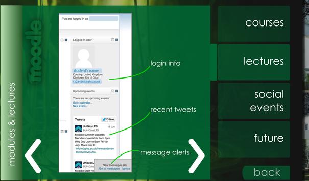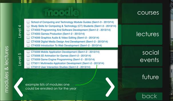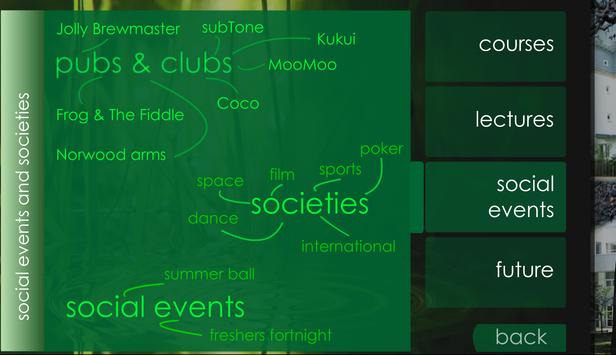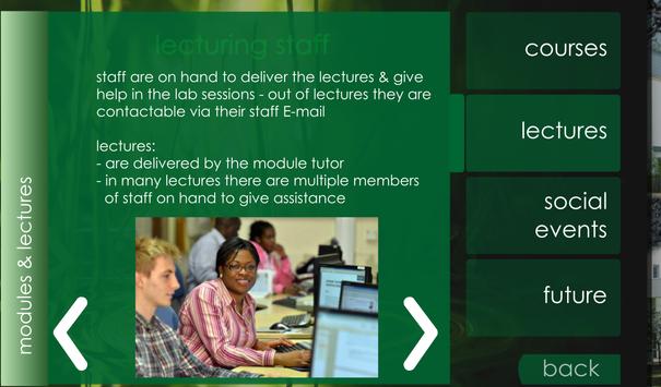 Within the app you can access an interactive map of the Park Campus, helping to familiarise yourself with the key places of interest - lecture rooms, labs, refectory, SU Bar, halls of residence... In the info section there is information on the nature of lectures, modules and course material, along with social events, activities, clubs, bars, and nights out.