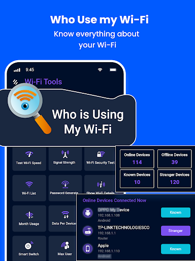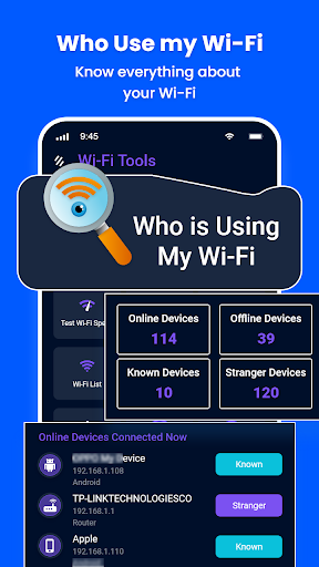 Scan my Wi-Fi and see how many devices are connected to your network by providing information about online and offline devices. You can mark them as 'Known' or 'Stranger' or block them from your Wi-Fi Router.