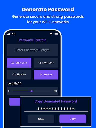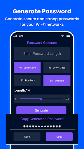 Generate secure and strong passwords for your Wi-Fi networks. Password Creator helps create stronger combinations using upper and lower-case letters, symbols, and digits..