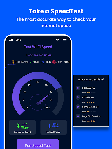 With just one tap, The Speed Test app will test internet speed and show accurate broadband speed test results quickly including Wi-Fi, LTE, 4G, and 3G networks