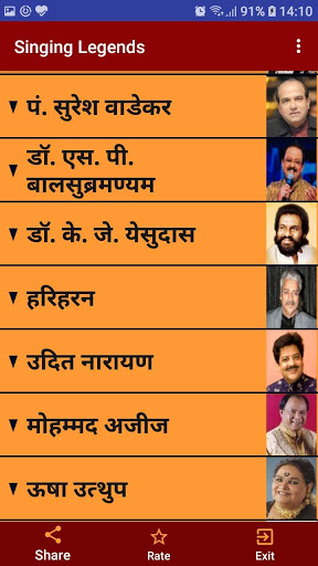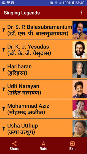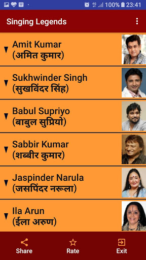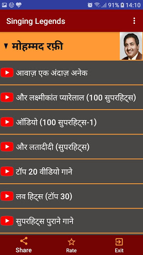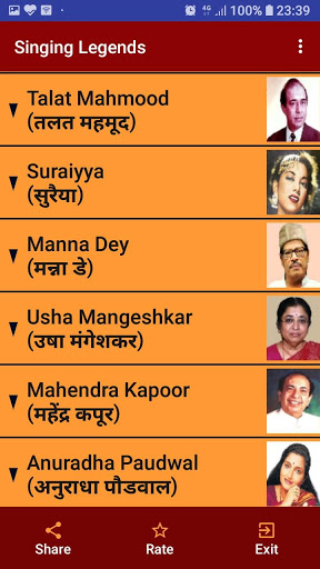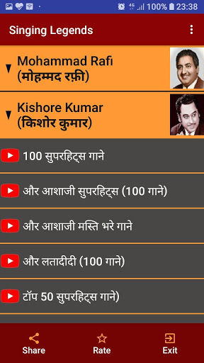 Ang app na ito kasama ang lahat ng mga mang-aawit ng Legendry Sa bawat mang-aawit, isang listahan ng iba't ibang mga kategorya tulad ng evergreen, romantikong, malungkot, superhits, top-10, top-20, atbp. Ng mga kanta ay ipinapakita mula sa kung saan ang anumang kanta sa YouTube ay maaaring i-play sa pamamagitan ng isang solong pag-click Ang mga pangalan ng mang-aawit ay ibinigay tulad ng sumusunod:
