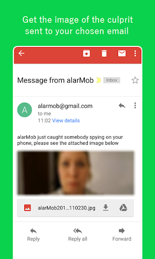 One of the main keys of alarMob is that if somebody attempts to steal or spy on you, a photo of them will be taken with your facing camera when they put the incorrect password or try to put the volume down when they realize that you have a very loud alarm on and very bright flashing lights. The photo will be saved into your gallery, in your history of alarMob and automatically will be sent to your chosen email address.