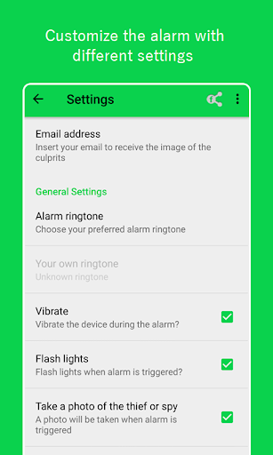We have made an App not only the alarm will sound loud with very bright flashing lights that will immediately make you aware that someone is trying to steal it, but we also made it to take a photo of them during the act.