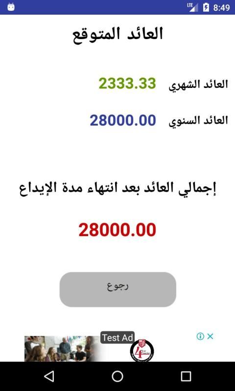 ليتم حساب العائد الشهري، و السنوي، و كذلك إجمالي العائد بعد انتهاء المدة