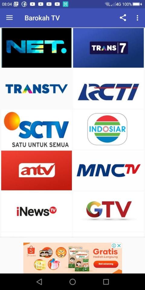 Barokah TV - Live Streaming National TV Indonesia is an application to watch Tv Indonesia Online for free and saves internet quota. Popular channels available such as NET, Indosiar, RCTI, SCTV, MNC TV, GTV, Trans7, TransTV, TV One, MetroTV, ANTV, iNewsTV, TVRI, CNN Indonesia, News One, RTV and Kompas TV.