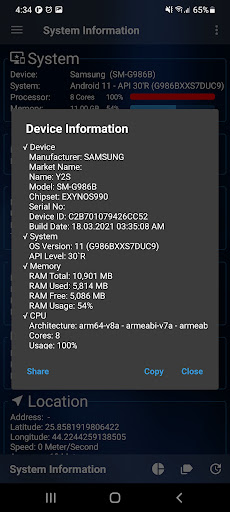 * Device: CPU, RAM, Storage, Manufacturer, Model, Chipset, SerialNo