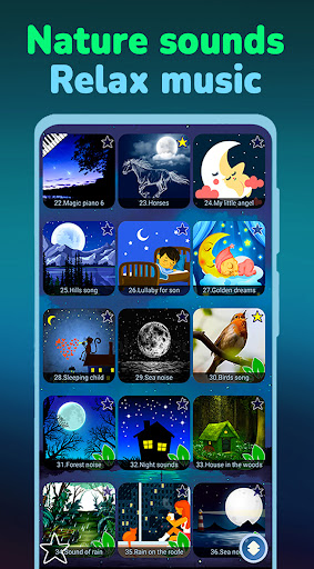 36 melodies for falling asleep, relaxing and calming the child, as well as sounds of nature.