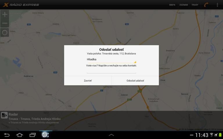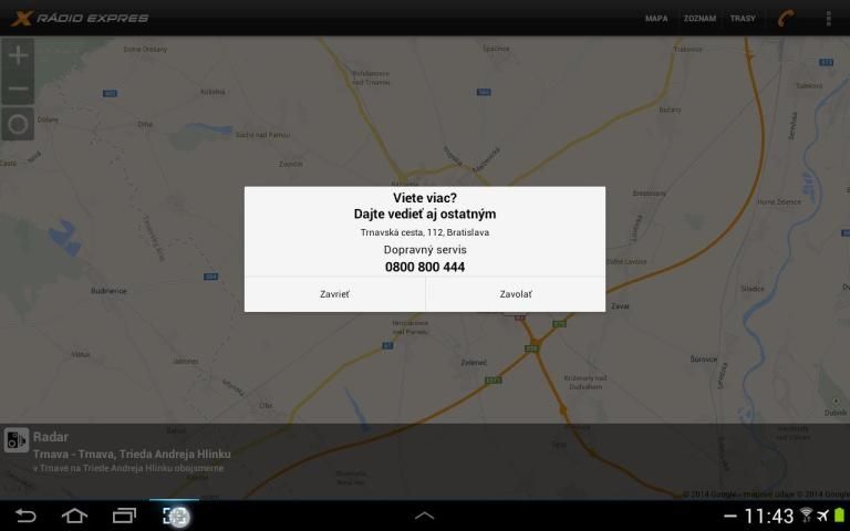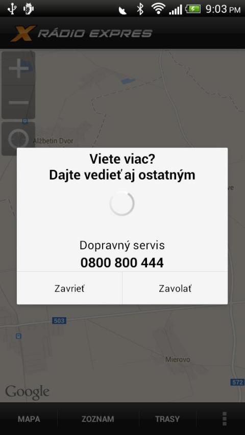 * možnosť zavolať do dopravného servisu priamo z aplikácie a nahlásiť udalosť pre ostatných užívateľov a poslucháčov Rádia Expres.